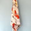 This is a long rectangular scarf in chiffon silk that is so light and sleek you won’t even feel it, so it suits perfectly for warmer days as well. It shows a beautiful forest scenery with wolves running through the birch trees. The black and white design pops with the wolves in bright orange.